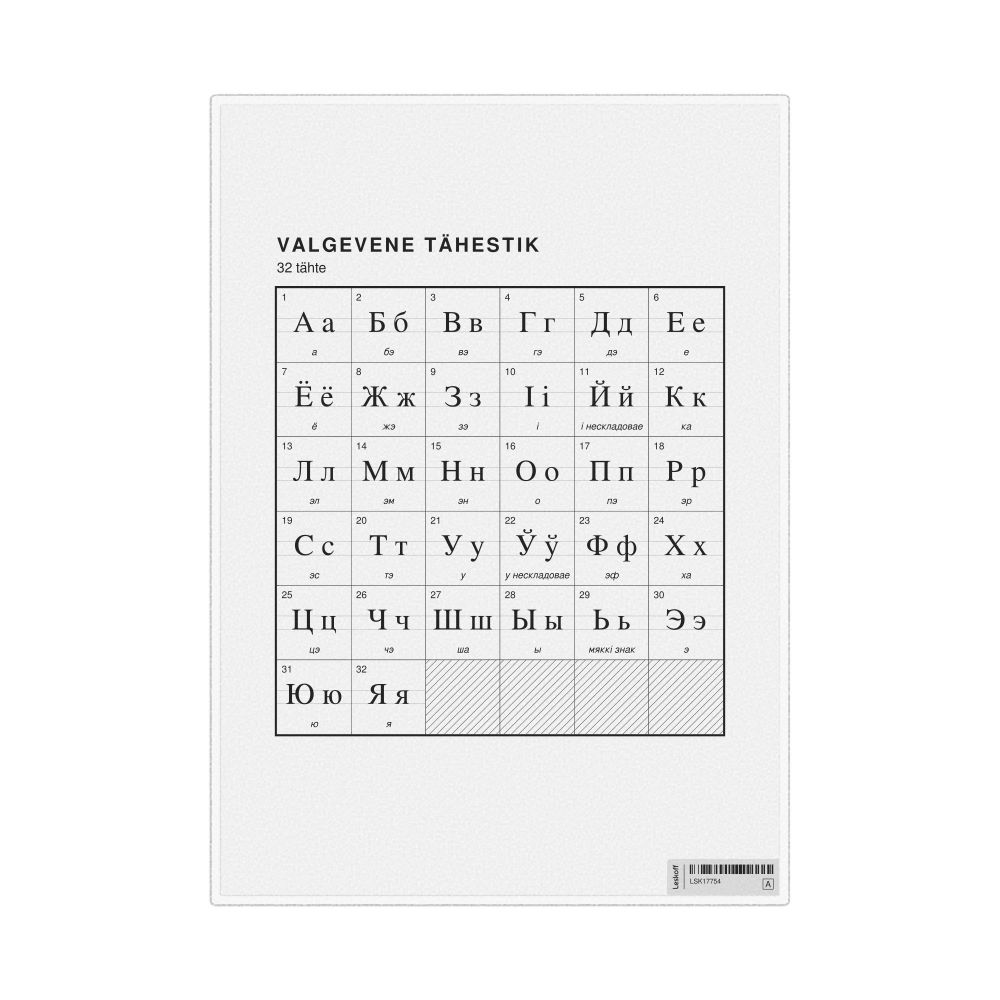 The Belarusian alphabet chart (the full set of letters) labeled in Estonian (Valgevene tähestik) in the 8.3 x 11.7 in (21.0 x 29.7 cm, desk chart, laminated) format.