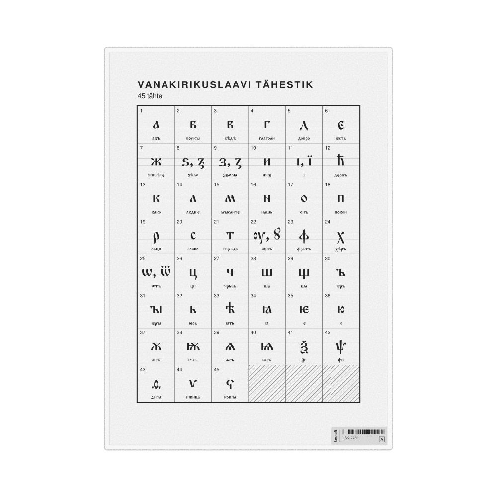The Old Church Slavonic alphabet chart (the full set of letters) labeled in Estonian (Vanakirikuslaavi tähestik) in the 8.3 x 11.7 in (21.0 x 29.7 cm, desk chart, laminated) format.