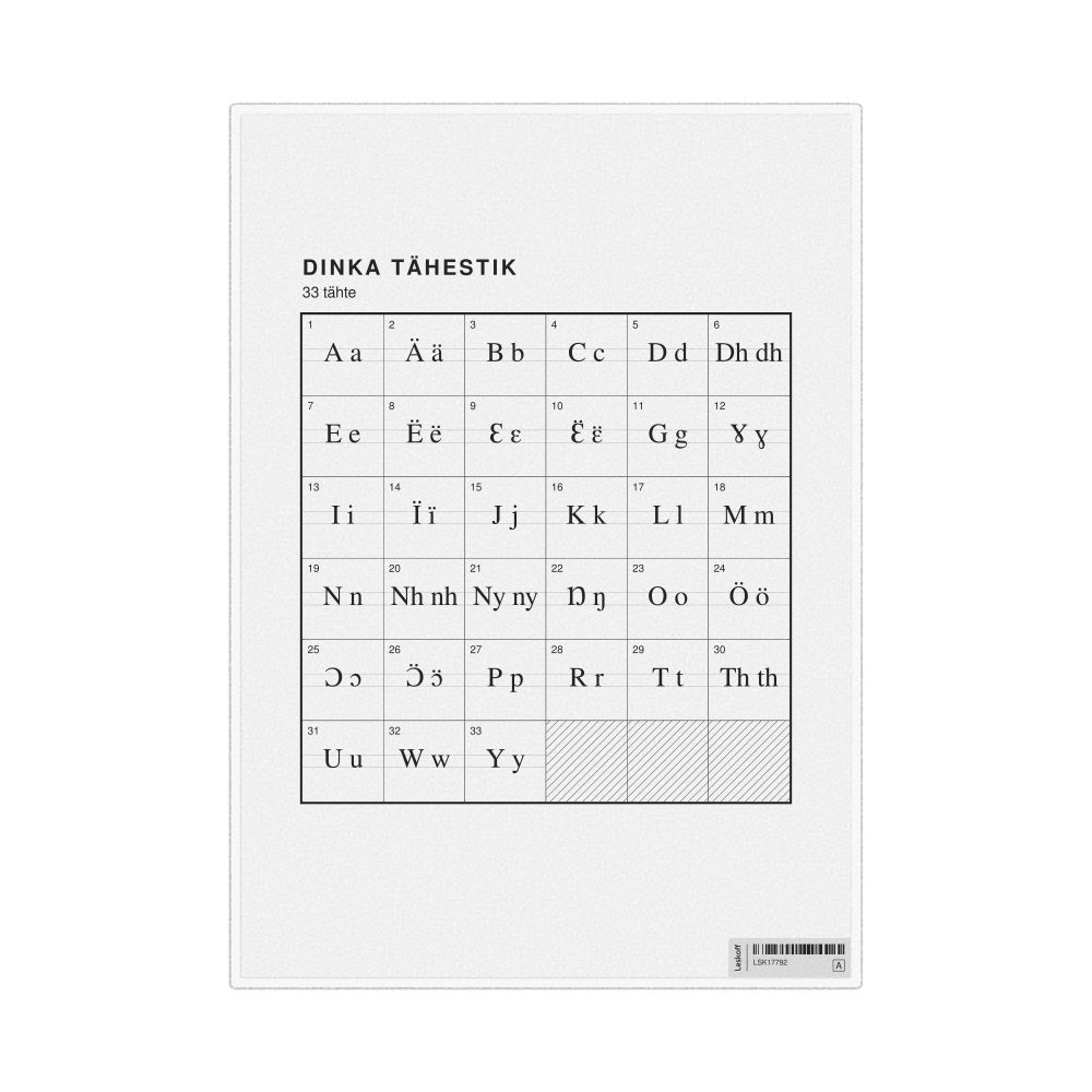 - Linguists and philologists - For both professionals and hobbyists, this alphabet print serves as a piece of linguistic art that presents the character inventory of Dinka as a linguistic (graphemic) dataset. Add this to your Dinka collection to complement your studies and research. A mixture of Dinka letters and Estonian metatext makes it a unique, visually intriguing illustration of linguistic diversity and interaction.
