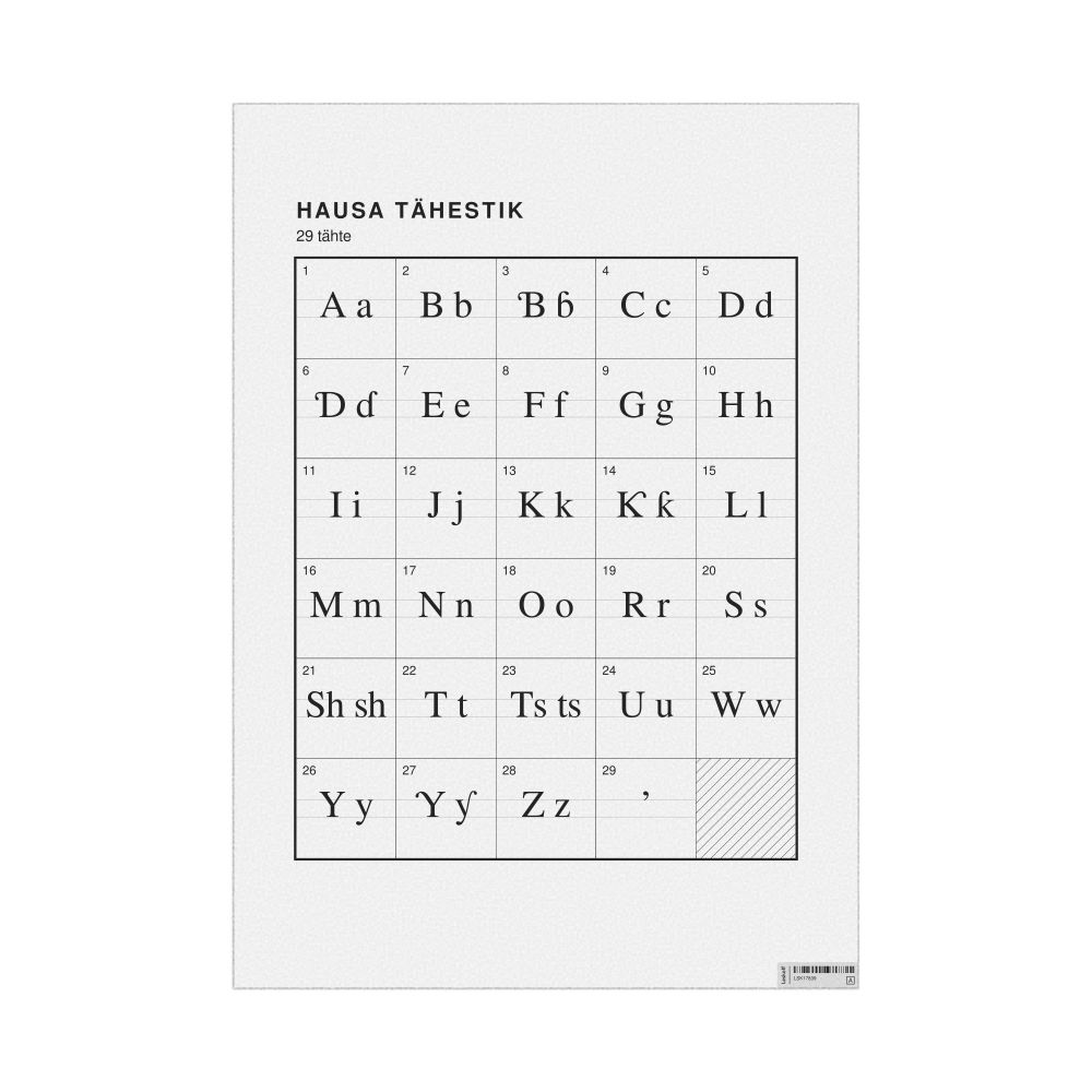 The Hausa alphabet chart (the full set of letters) labeled in Estonian (Hausa tähestik) in the 23.4 x 33.1 in (59.4 x 84.1 cm, poster / wall chart) format.