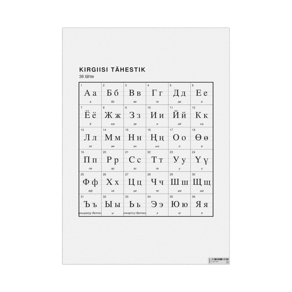 The Kyrgyz alphabet chart (the full set of letters) labeled in Estonian (Kirgiisi tähestik) in the 23.4 x 33.1 in (59.4 x 84.1 cm, poster / wall chart) format.