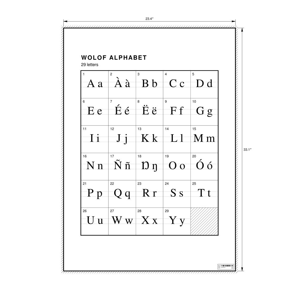 The Wolof alphabet chart (the full set of letters) in the 23.4 x 33.1 in (59.4 x 84.1 cm, poster / wall chart) format.