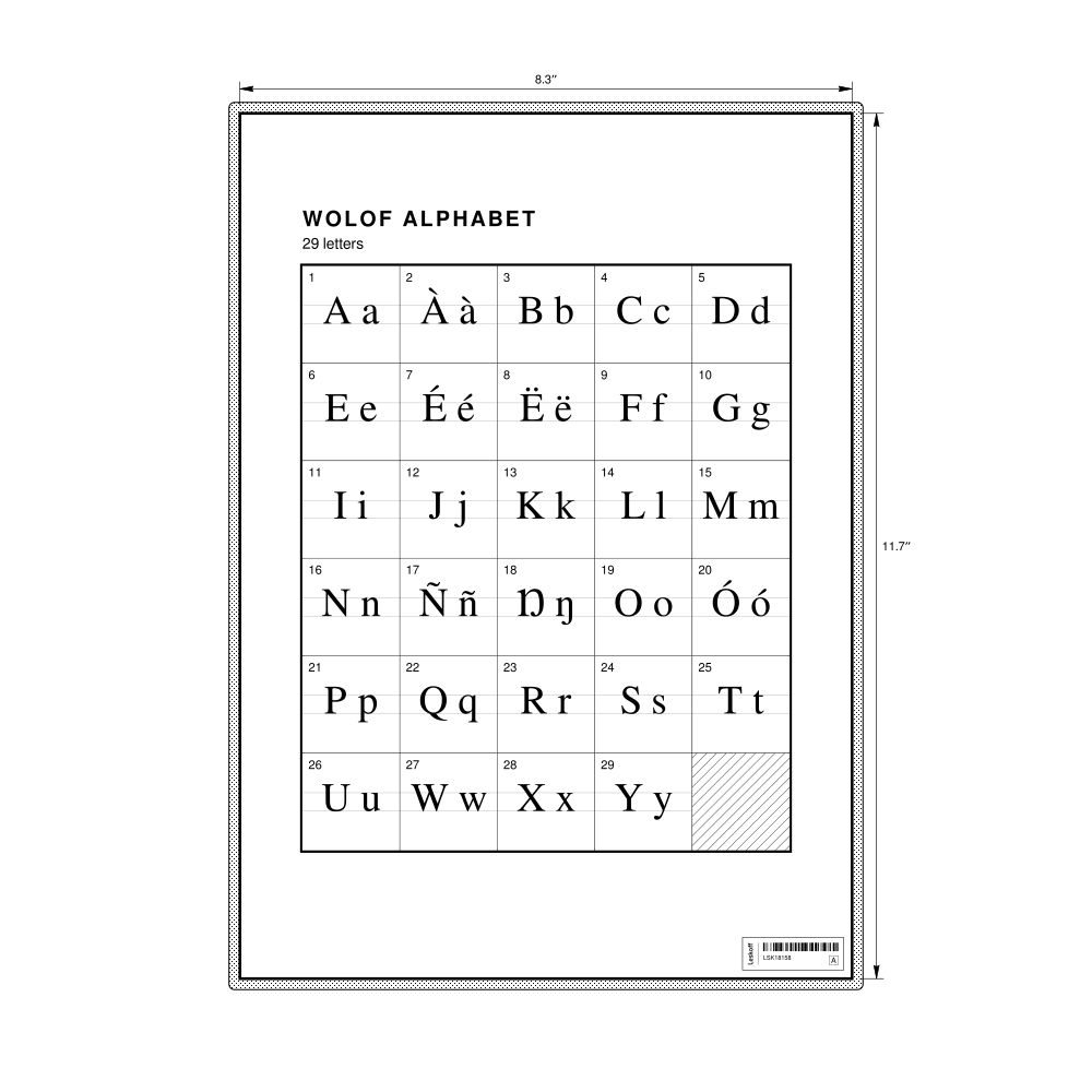 The Wolof alphabet chart (the full set of letters) in the 8.3 x 11.7 in (21.0 x 29.7 cm, desk chart, laminated) format.
