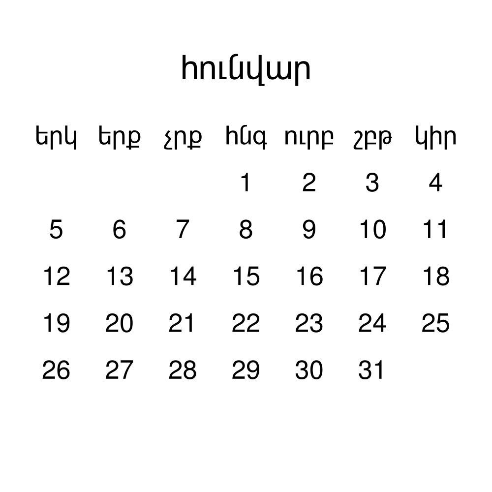 - Armenian speakers and enthusiasts - Choose this calendar if you are looking for a simple, localized calendar in the Armenian language. Use it in your home, office, or classroom as a regular calendar.