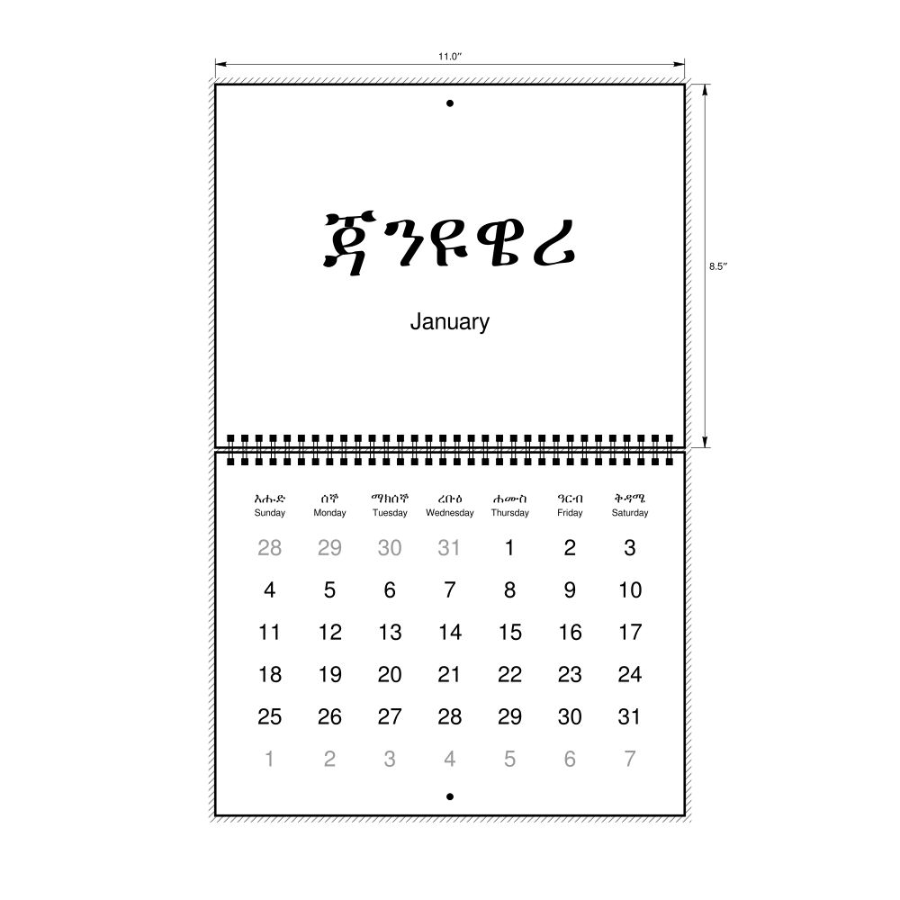 2026 Wall CalendarAmharic/English-Labeled, Sunday-Start Layout, Wire-Bound, 11 x 8.5 in (27.9 x 21.6 cm)