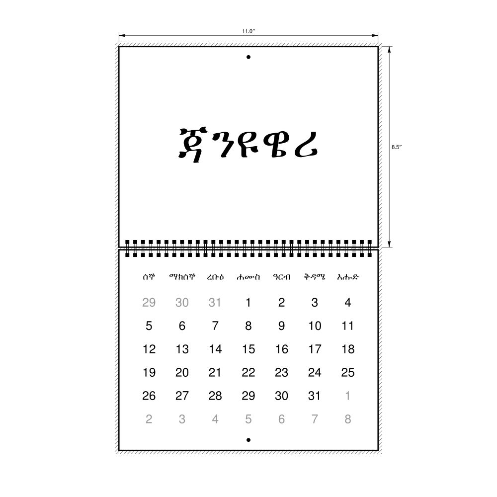 2026 Wall Calendar, Amharic-Labeled, Monday-Start Layout, Wire-Bound, 11 x 8.5 in (27.9 x 21.6 cm)