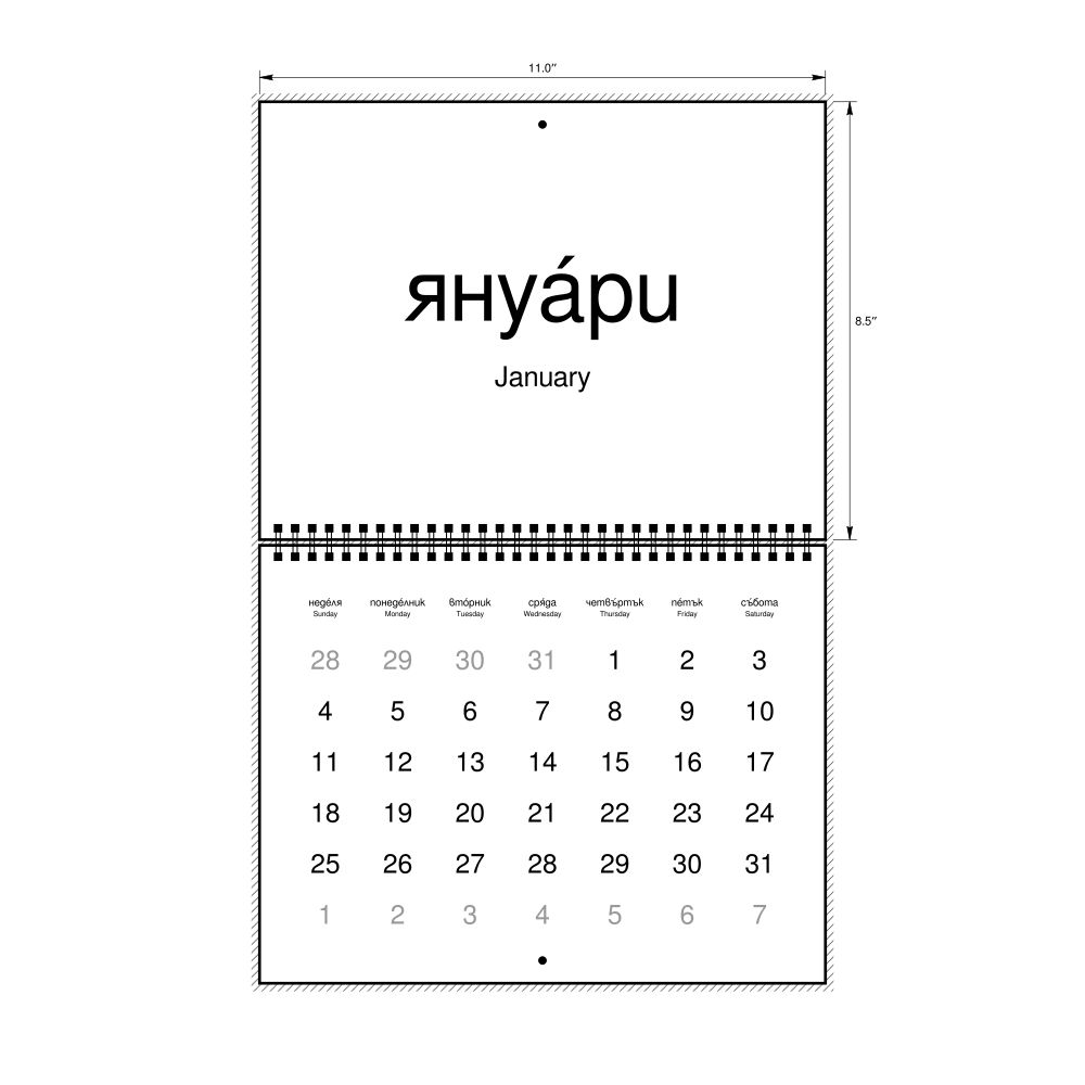 2026 Wall CalendarBulgarian/English-Labeled, Sunday-Start Layout, Wire-Bound, 11 x 8.5 in (27.9 x 21.6 cm)