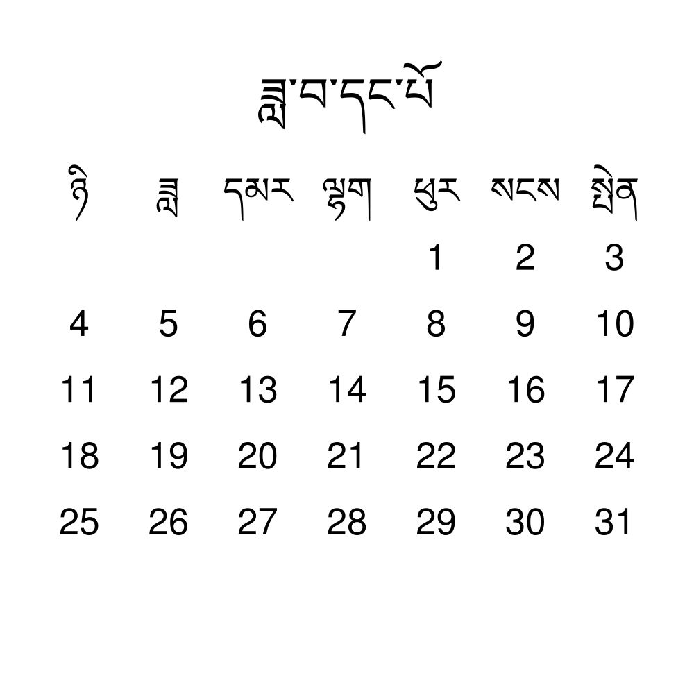 This calendar features the Tibetan names of months and days of the week on top of a standard Gregorian calendar layout. Beyond its utility for tracking dates, it serves as an educational tool, cultural touchstone (cultural artifact), and functional decor (aesthetic object).
