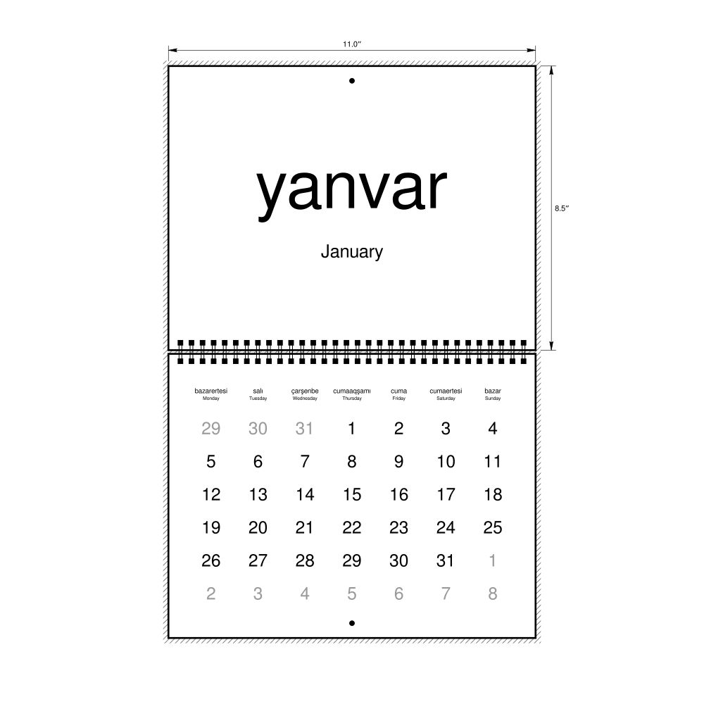 2026 Wall CalendarCrimean Tatar/English-Labeled, Monday-Start Layout, Wire-Bound, 11 x 8.5 in (27.9 x 21.6 cm)