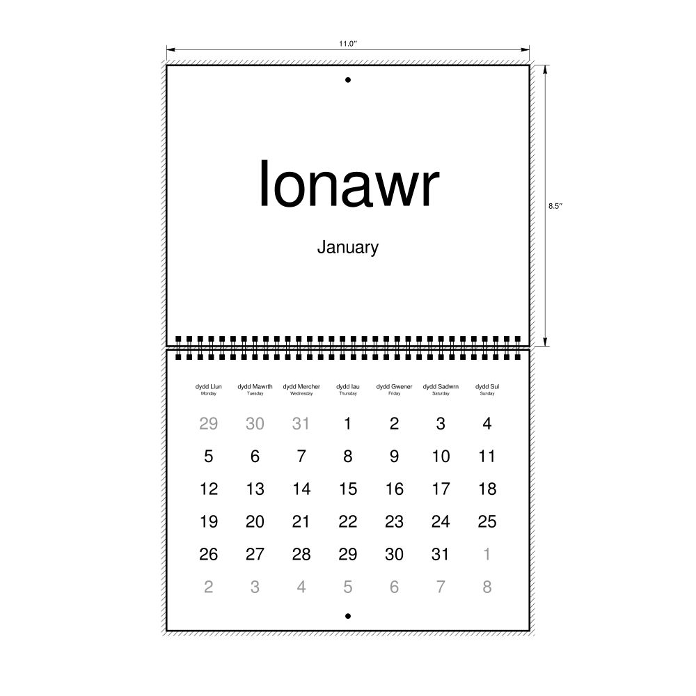 2026 Wall CalendarWelsh/English-Labeled, Monday-Start Layout, Wire-Bound, 11 x 8.5 in (27.9 x 21.6 cm)