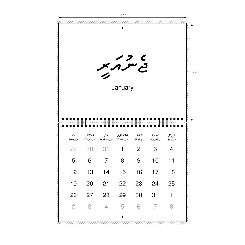 2026 Wall CalendarMaldivian/English-Labeled, Monday-Start Layout, Wire-Bound, 11 x 8.5 in (27.9 x 21.6 cm)