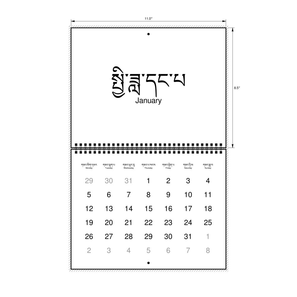 2026 Wall CalendarDzongkha/English-Labeled, Monday-Start Layout, Wire-Bound, 11 x 8.5 in (27.9 x 21.6 cm)