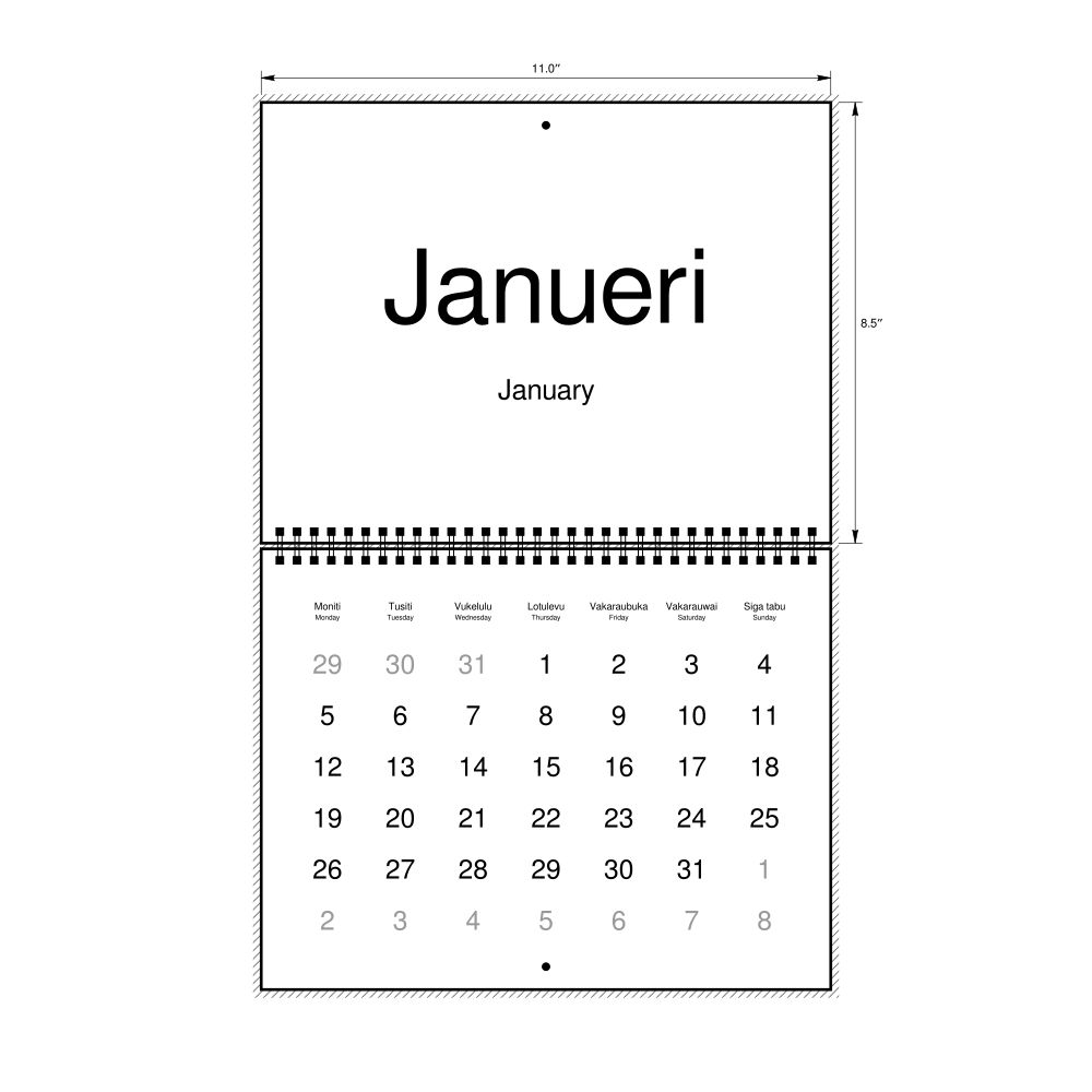 2026 Wall CalendarFijian/English-Labeled, Monday-Start Layout, Wire-Bound, 11 x 8.5 in (27.9 x 21.6 cm)