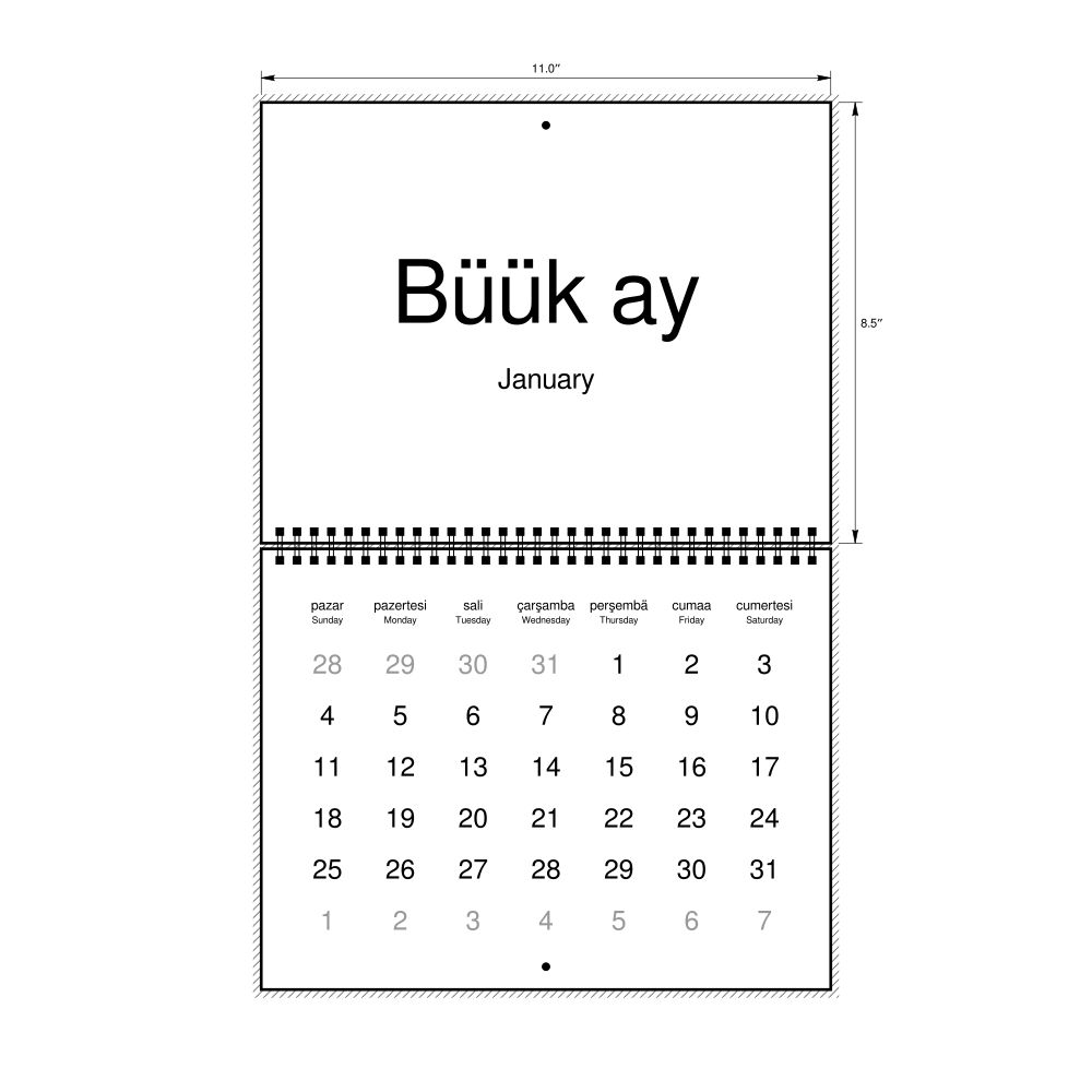 2026 Wall CalendarGagauz/English-Labeled, Sunday-Start Layout, Wire-Bound, 11 x 8.5 in (27.9 x 21.6 cm)