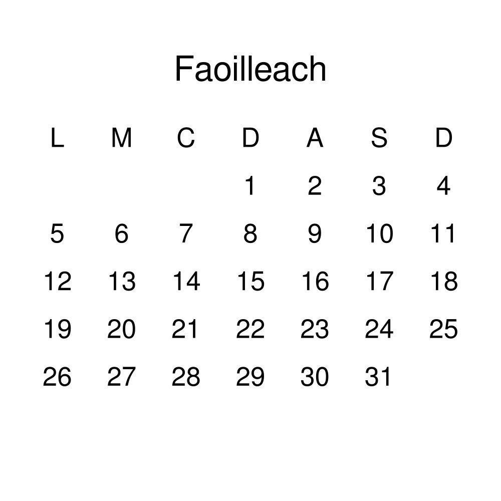 This calendar features the Scottish Gaelic names of months and days of the week on top of a standard Gregorian calendar layout. Beyond its utility for tracking dates, it serves as an educational tool, cultural touchstone (cultural artifact), and functional decor (aesthetic object).