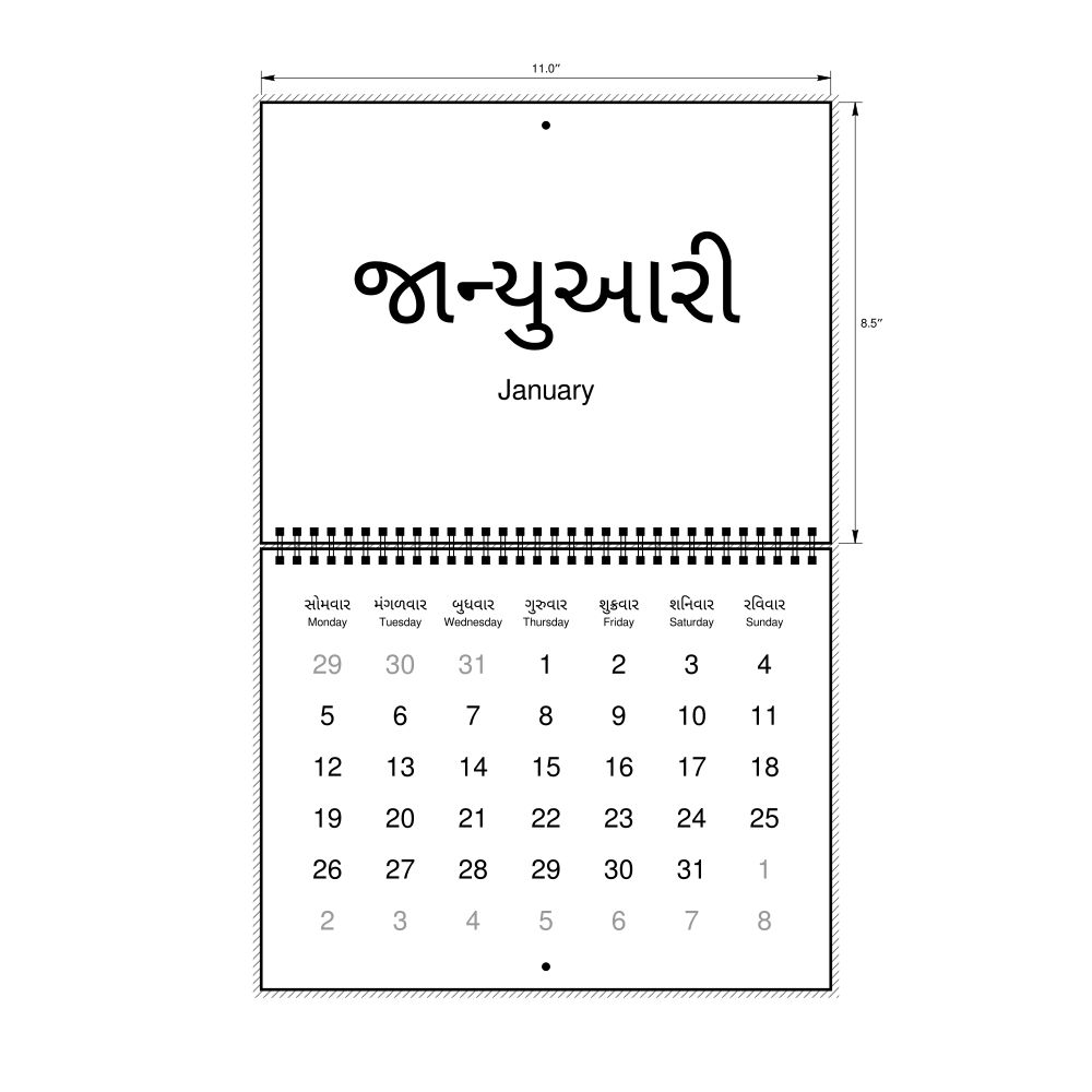 2026 Wall CalendarGujarati/English-Labeled, Monday-Start Layout, Wire-Bound, 11 x 8.5 in (27.9 x 21.6 cm)
