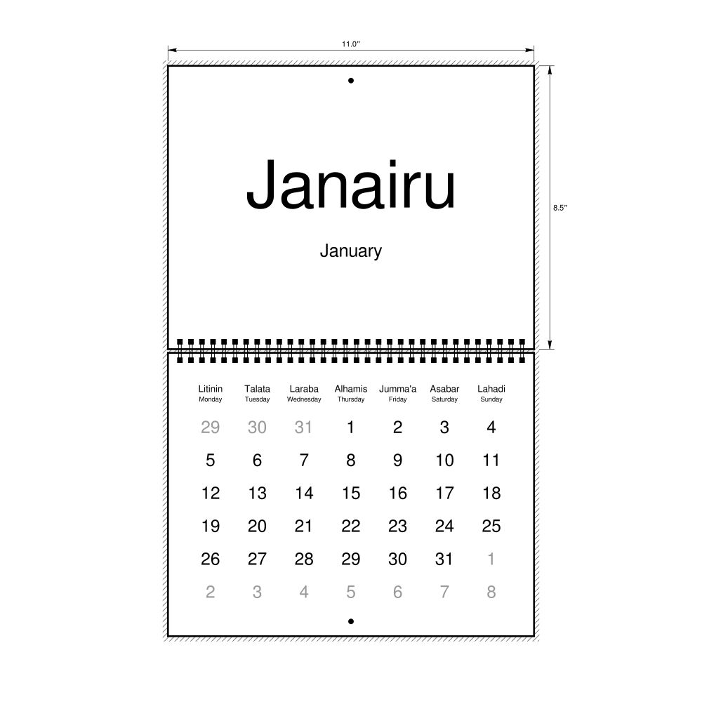 2027 Wall Calendar, Hausa/English-Labeled, Sunday-Start Layout, Wire-Bound, 11 x 8.5 in (27.9 x 21.6 cm)