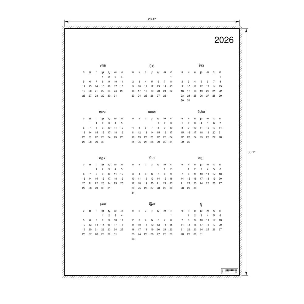 2026 Wall Calendar, Khmer-Labeled, Monday-Start Layout, Poster / Wall Print, 23.4 x 33.1 in (59.4 x 84.1 cm)