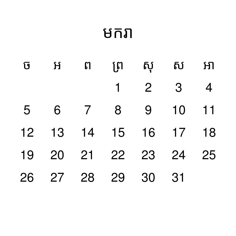 • Khmer heritage speakers and cultural connectors - For individuals seeking to maintain a connection to their history, ancestral roots, or the culture associated with the Khmer language, the calendar serves as a daily cultural marker. Use it in your home, office, library, or museum as a link to linguistic and cultural identity that integrates Khmer into your everyday life. Familiar language script and naming conventions may also provide a sense of home in a foreign environment.