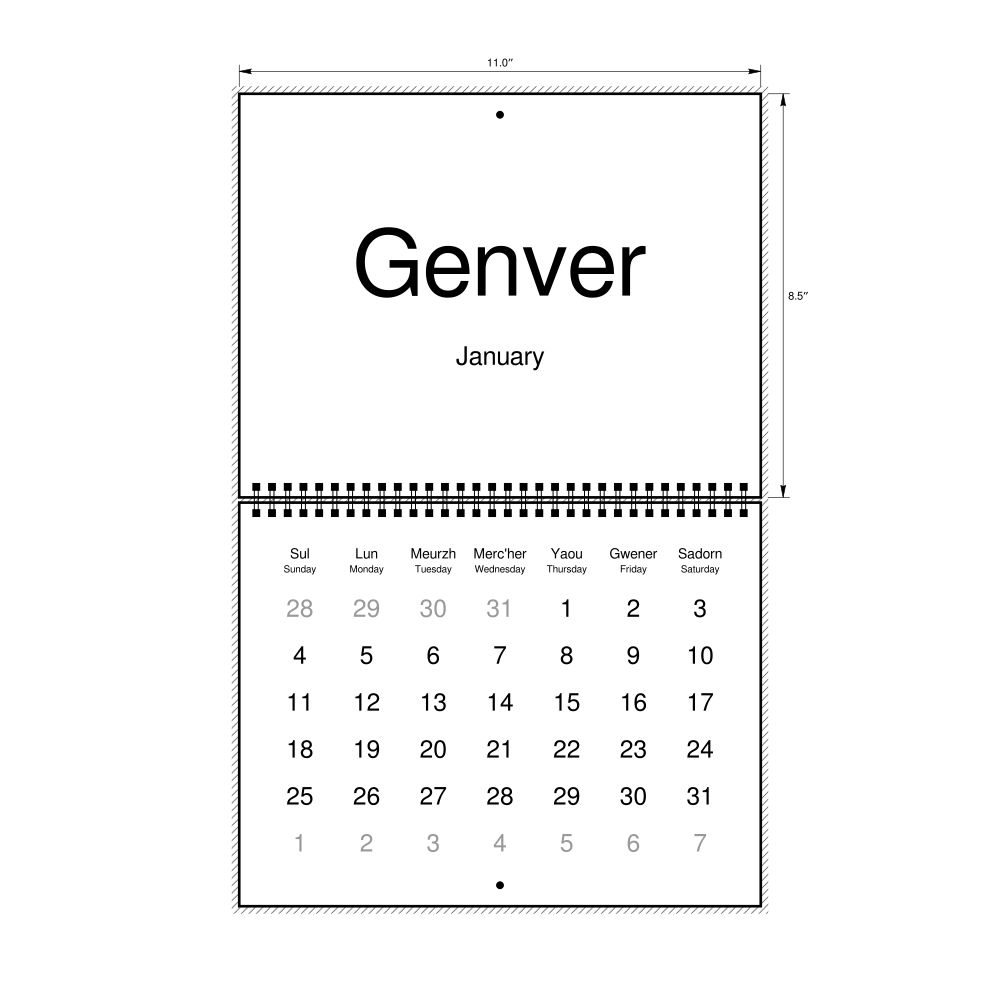 2026 Wall CalendarBreton/English-Labeled, Sunday-Start Layout, Wire-Bound, 11 x 8.5 in (27.9 x 21.6 cm)