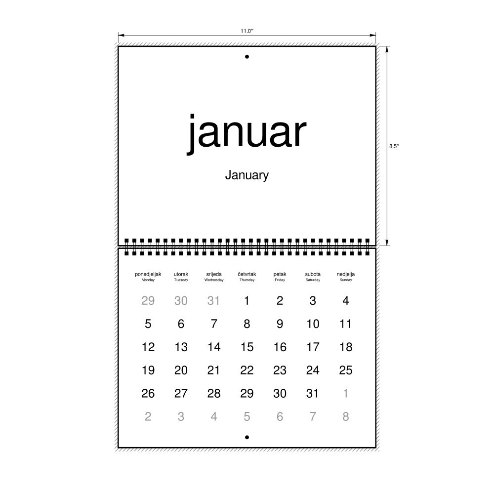 2026 Wall CalendarBosnian/English-Labeled, Monday-Start Layout, Wire-Bound, 11 x 8.5 in (27.9 x 21.6 cm)