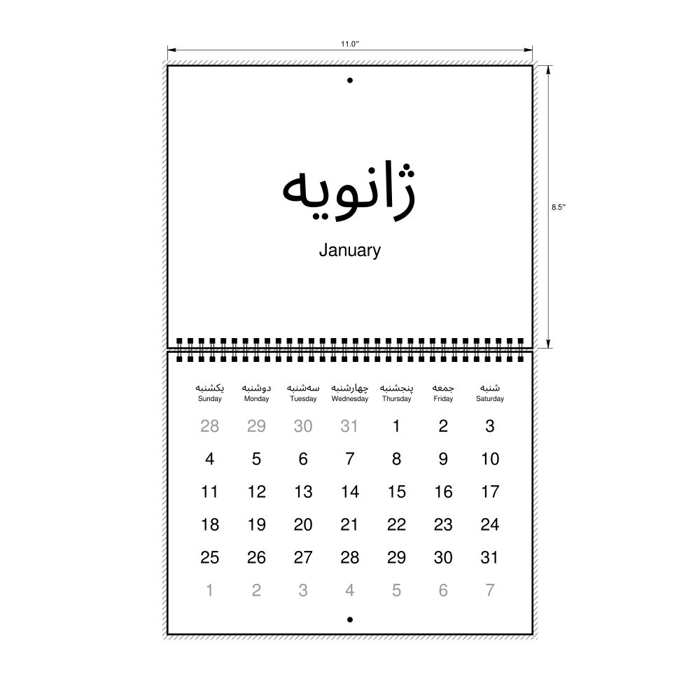2026 Wall CalendarPersian/English-Labeled, Sunday-Start Layout, Wire-Bound, 11 x 8.5 in (27.9 x 21.6 cm)