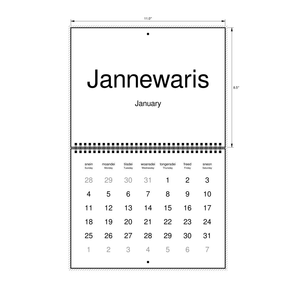 2026 Wall CalendarWest Frisian/English-Labeled, Sunday-Start Layout, Wire-Bound, 11 x 8.5 in (27.9 x 21.6 cm)
