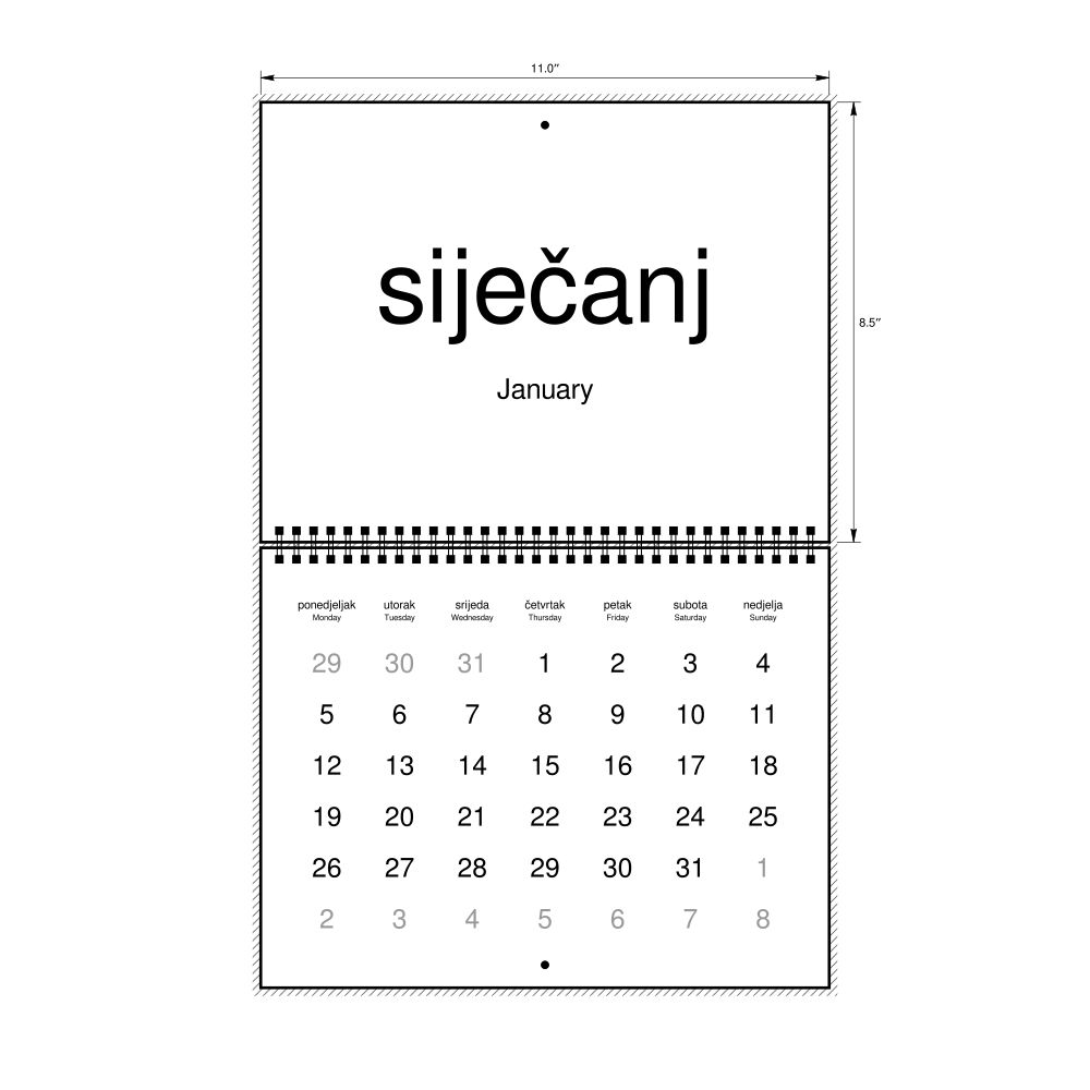 2026 Wall CalendarCroatian/English-Labeled, Monday-Start Layout, Wire-Bound, 11 x 8.5 in (27.9 x 21.6 cm)