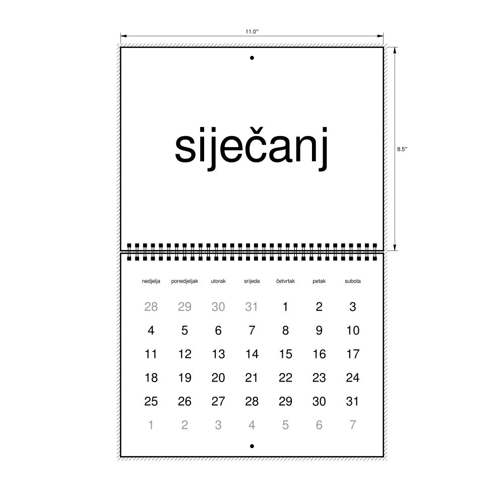 2026 Wall Calendar, Croatian-Labeled, Sunday-Start Layout, Wire-Bound, 11 x 8.5 in (27.9 x 21.6 cm)