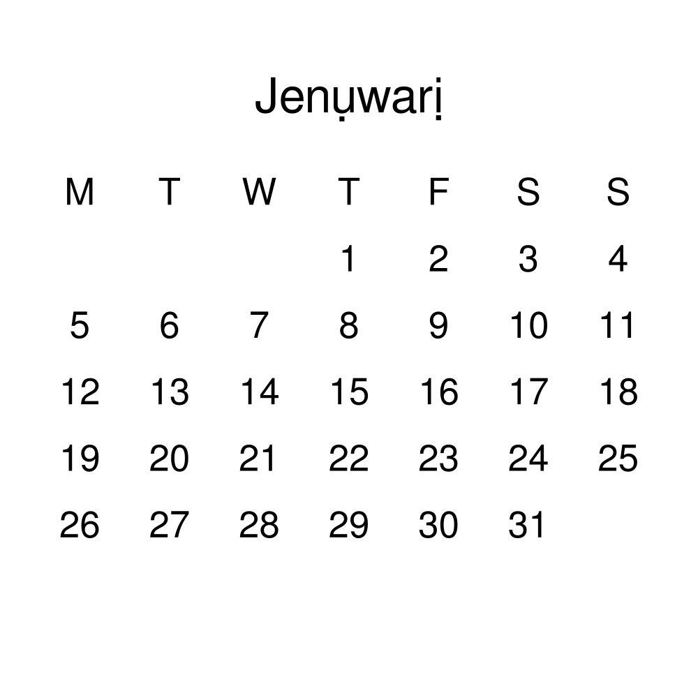 - Linguistics enthusiasts and polyglots - For "language geeks" interested in comparative linguistics or the mechanics of different languages and who value the aesthetic differences in scripts, orthography, and typography of different languages, the Igbo calendar serves as an object of intellectual interest. You can collect calendars for various languages to compare their linguistic roots (e.g., comparing Romance languages vs. Slavic languages). Leskoff's calendars are characterized by specific typographic choices that highlight the orthography and script unique to the target language. Think correct usage of diacritics, characters, and directional writing (left-to-right vs. right-to-left). The minimalist design focuses on legibility and aesthetic appeal of the script itself.