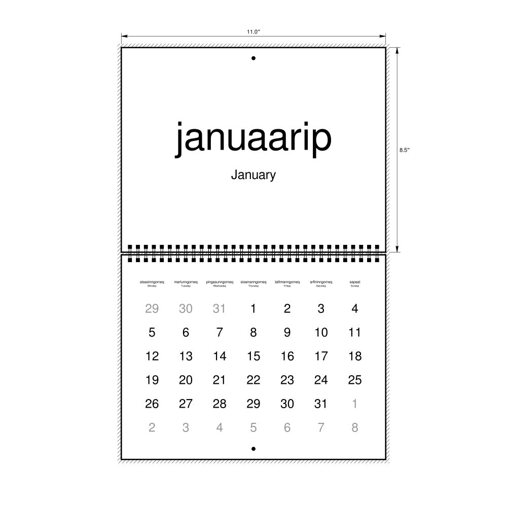 2026 Wall CalendarGreenlandic/English-Labeled, Monday-Start Layout, Wire-Bound, 11 x 8.5 in (27.9 x 21.6 cm)