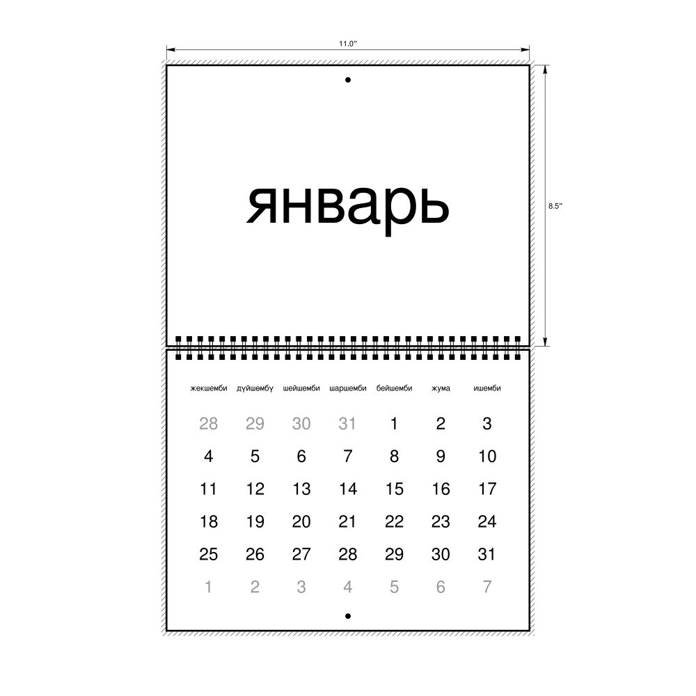 - Linguistics enthusiasts and polyglots - For "language geeks" interested in comparative linguistics or the mechanics of different languages and who value the aesthetic differences in scripts, orthography, and typography of different languages, the Kyrgyz calendar serves as an object of intellectual interest. You can collect calendars for various languages to compare their linguistic roots (e.g., comparing Romance languages vs. Slavic languages). Leskoff's calendars are characterized by specific typographic choices that highlight the orthography and script unique to the target language. Think correct usage of diacritics, characters, and directional writing (left-to-right vs. right-to-left). The minimalist design focuses on legibility and aesthetic appeal of the script itself.