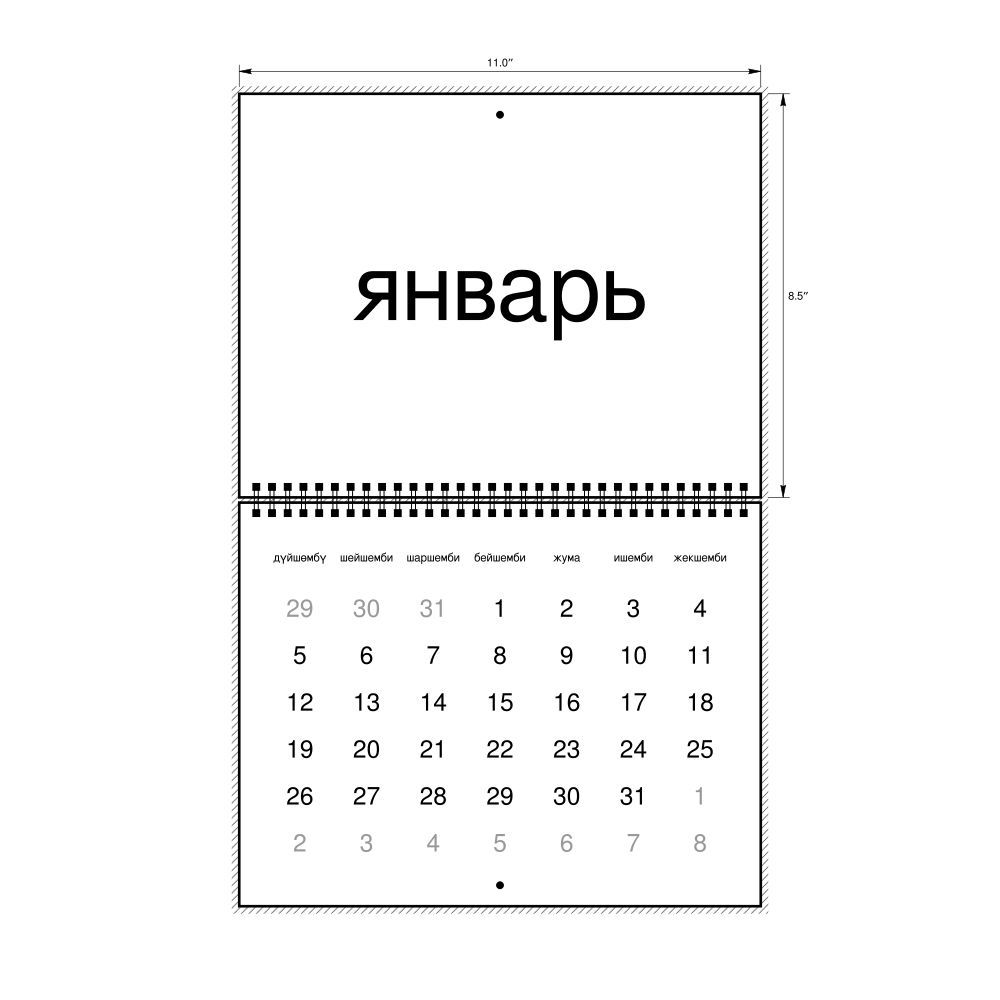 - Linguistics enthusiasts and polyglots - For "language geeks" interested in comparative linguistics or the mechanics of different languages and who value the aesthetic differences in scripts, orthography, and typography of different languages, the Kyrgyz calendar serves as an object of intellectual interest. You can collect calendars for various languages to compare their linguistic roots (e.g., comparing Romance languages vs. Slavic languages). Leskoff's calendars are characterized by specific typographic choices that highlight the orthography and script unique to the target language. Think correct usage of diacritics, characters, and directional writing (left-to-right vs. right-to-left). The minimalist design focuses on legibility and aesthetic appeal of the script itself.