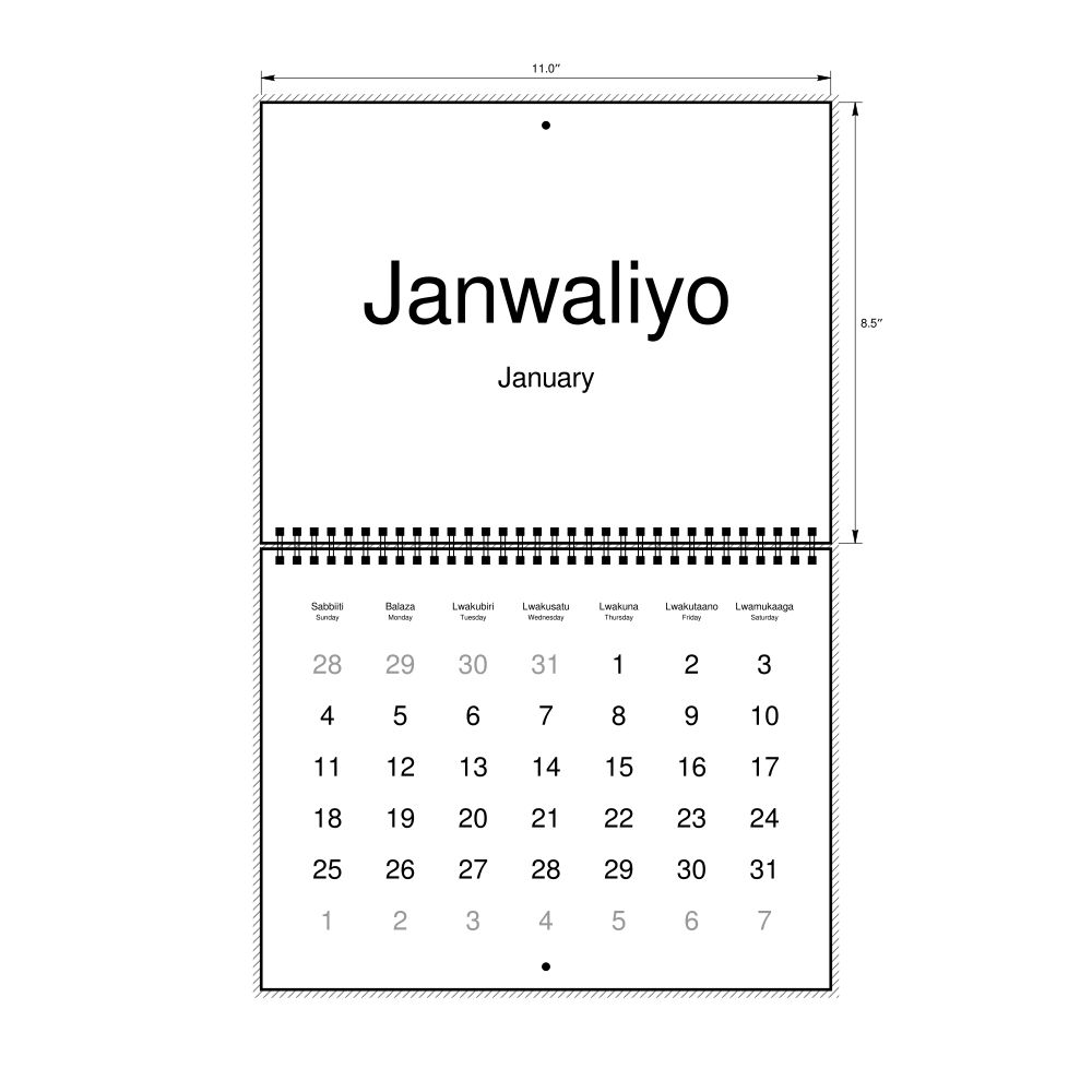 2026 Wall CalendarLuganda/English-Labeled, Sunday-Start Layout, Wire-Bound, 11 x 8.5 in (27.9 x 21.6 cm)