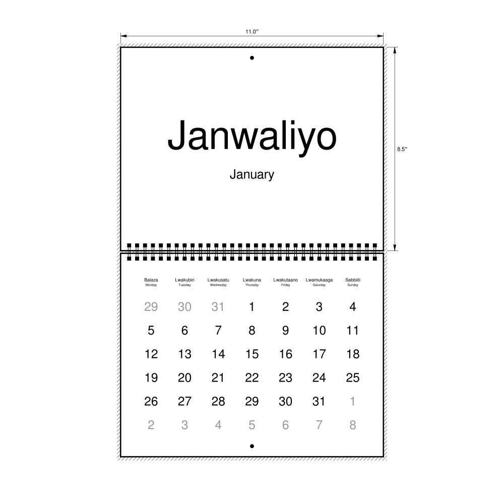 2026 Wall CalendarLuganda/English-Labeled, Monday-Start Layout, Wire-Bound, 11 x 8.5 in (27.9 x 21.6 cm)
