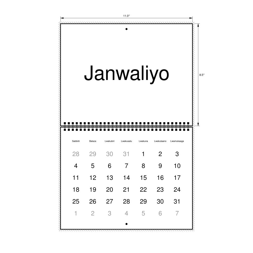 - Luganda heritage speakers and cultural connectors - For individuals seeking to maintain a connection to their history, ancestral roots, or the culture associated with the Luganda language, the calendar serves as a daily cultural marker. Use it in your home, office, library, or museum as a link to linguistic and cultural identity that integrates Luganda into your everyday life. Familiar language script and naming conventions may also provide a sense of home in a foreign environment.