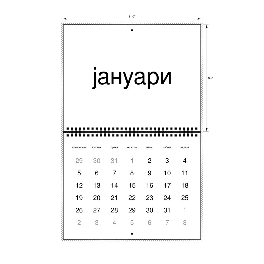 • Linguistics enthusiasts and polyglots - For "language geeks" interested in comparative linguistics or the mechanics of different languages and who value the aesthetic differences in scripts, orthography, and typography of different languages, the Macedonian calendar serves as an object of intellectual interest. You can collect calendars for various languages to compare their linguistic roots (e.g., comparing Romance languages vs. Slavic languages). Leskoff's calendars are characterized by specific typographic choices that highlight the orthography and script unique to the target language. Think correct usage of diacritics, characters, and directional writing (left-to-right vs. right-to-left). The minimalist design focuses on legibility and aesthetic appeal of the script itself.
