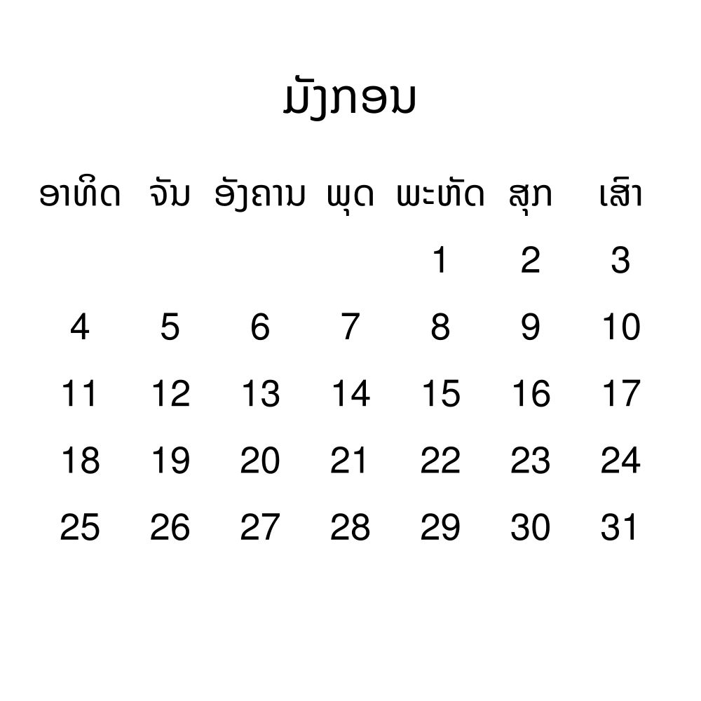 - Lao heritage speakers and cultural connectors - For individuals seeking to maintain a connection to their history, ancestral roots, or the culture associated with the Lao language, the calendar serves as a daily cultural marker. Use it in your home, office, library, or museum as a link to linguistic and cultural identity that integrates Lao into your everyday life. Familiar language script and naming conventions may also provide a sense of home in a foreign environment.