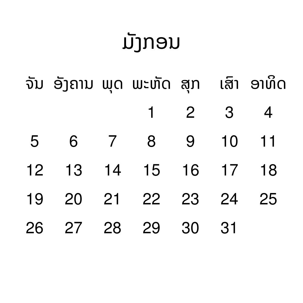 - Lao heritage speakers and cultural connectors - For individuals seeking to maintain a connection to their history, ancestral roots, or the culture associated with the Lao language, the calendar serves as a daily cultural marker. Use it in your home, office, library, or museum as a link to linguistic and cultural identity that integrates Lao into your everyday life. Familiar language script and naming conventions may also provide a sense of home in a foreign environment.