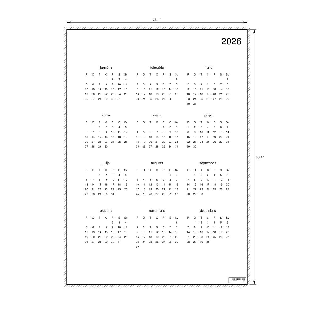 2026 Wall Calendar, Latvian-Labeled, Monday-Start Layout, Poster / Wall Print, 23.4 x 33.1 in (59.4 x 84.1 cm)
