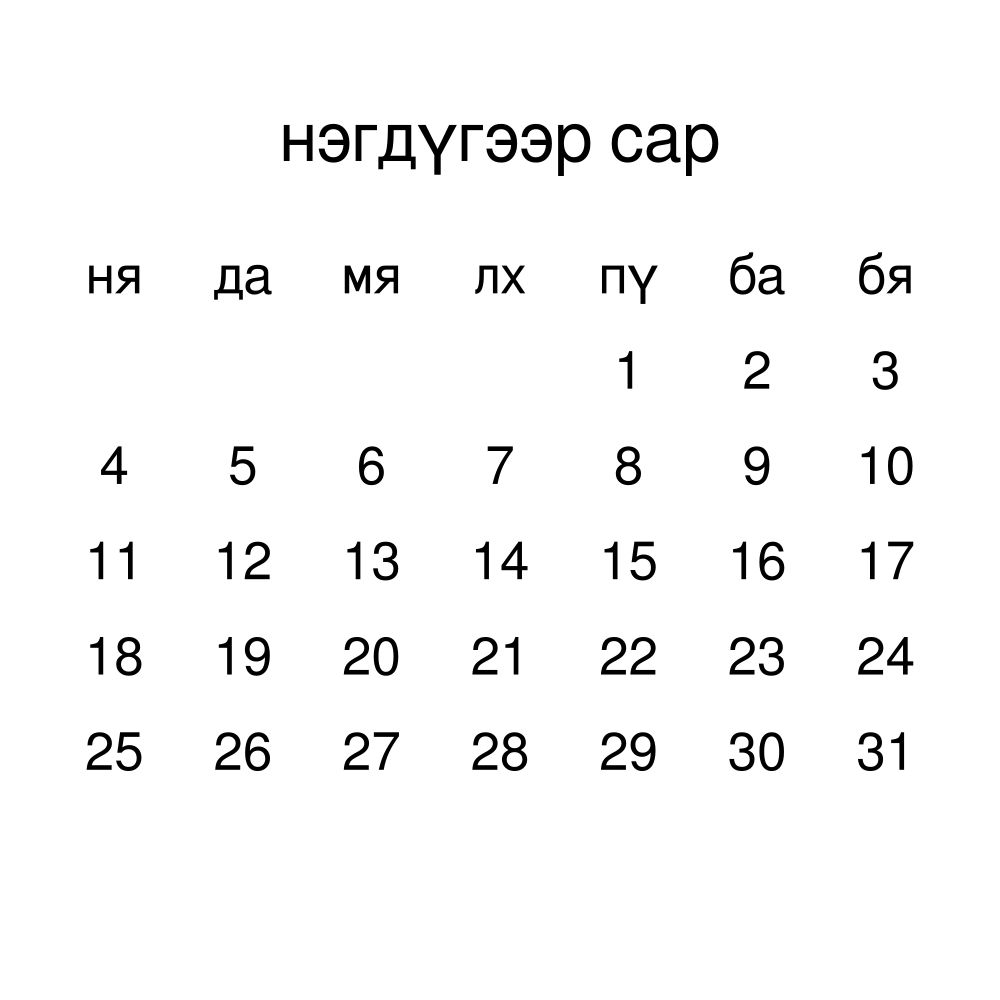 This calendar features the Mongolian names of months and days of the week on top of a standard Gregorian calendar layout. Beyond its utility for tracking dates, it serves as an educational tool, cultural touchstone (cultural artifact), and functional decor (aesthetic object).