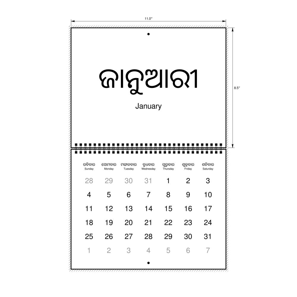 2026 Wall Calendar, Odia-Labeled, Sunday-Start Layout, Wire-Bound, 11 x 8.5 in (27.9 x 21.6 cm)