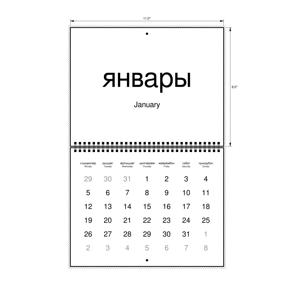 2027 Wall Calendar, Ossetian-Labeled, Sunday-Start Layout, Wire-Bound, 11 x 8.5 in (27.9 x 21.6 cm)