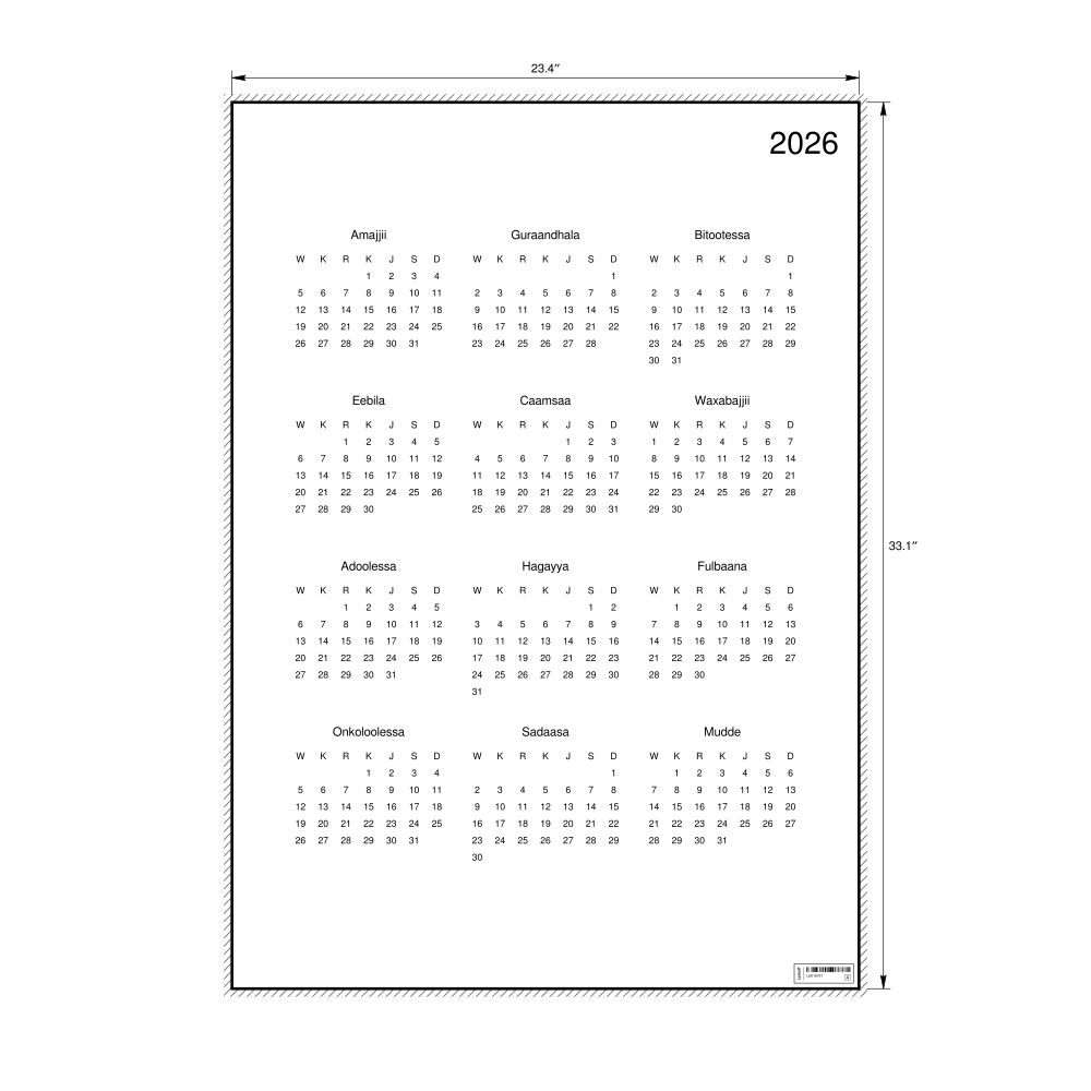 - Oromo heritage speakers and cultural connectors - For individuals seeking to maintain a connection to their history, ancestral roots, or the culture associated with the Oromo language, the calendar serves as a daily cultural marker. Use it in your home, office, library, or museum as a link to linguistic and cultural identity that integrates Oromo into your everyday life. Familiar language script and naming conventions may also provide a sense of home in a foreign environment.