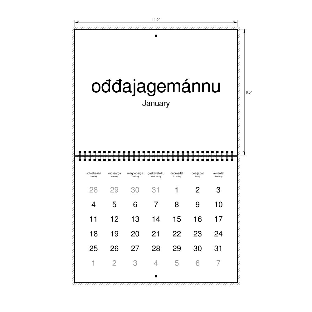 2026 Wall CalendarNorthern Sámi/English-Labeled, Sunday-Start Layout, Wire-Bound, 11 x 8.5 in (27.9 x 21.6 cm)