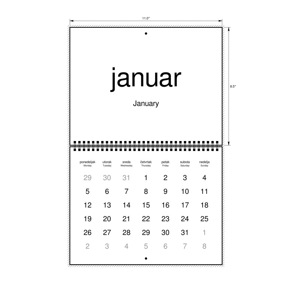 2026 Wall CalendarSerbian (Latin)/English-Labeled, Monday-Start Layout, Wire-Bound, 11 x 8.5 in (27.9 x 21.6 cm)