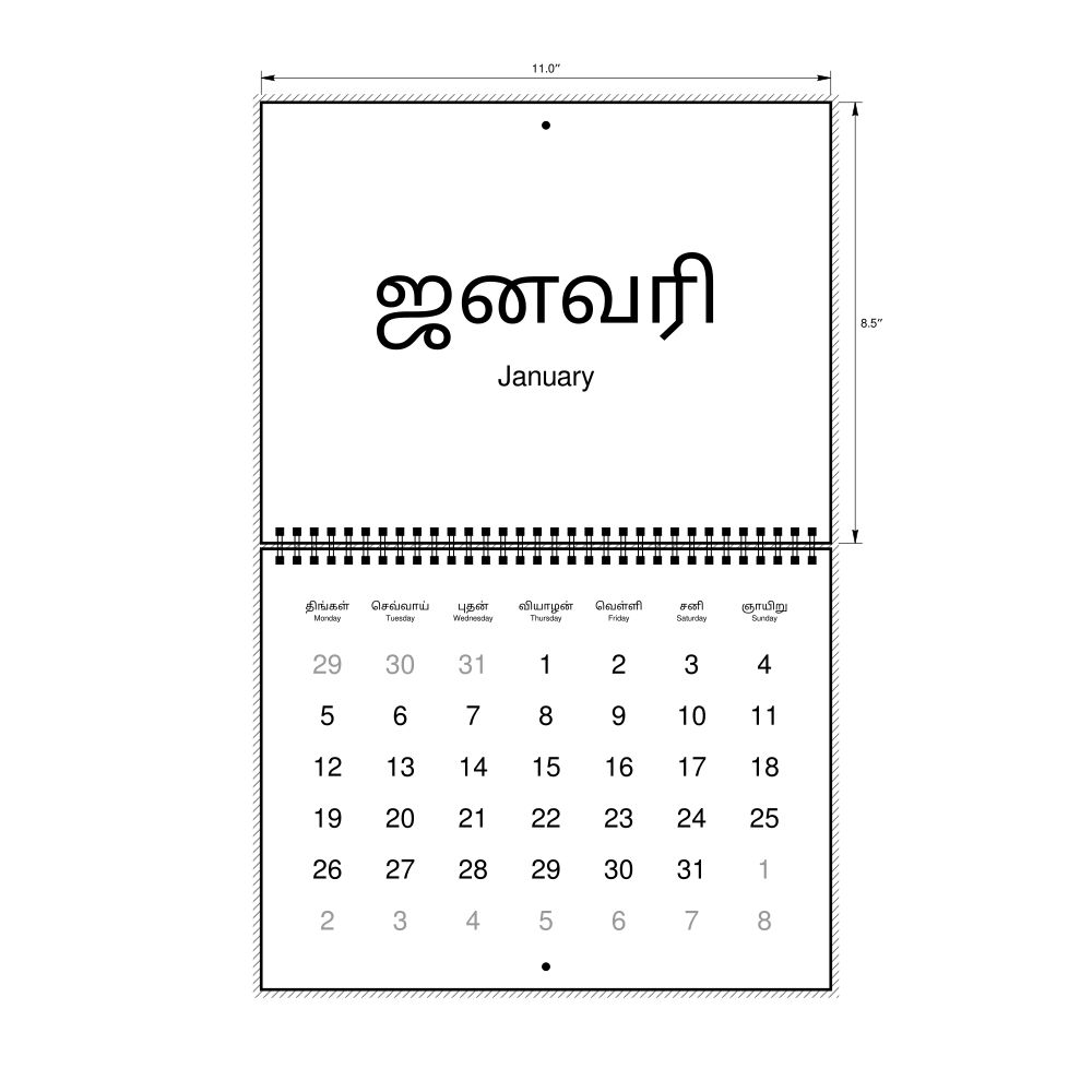 2026 Wall CalendarTamil/English-Labeled, Monday-Start Layout, Wire-Bound, 11 x 8.5 in (27.9 x 21.6 cm)