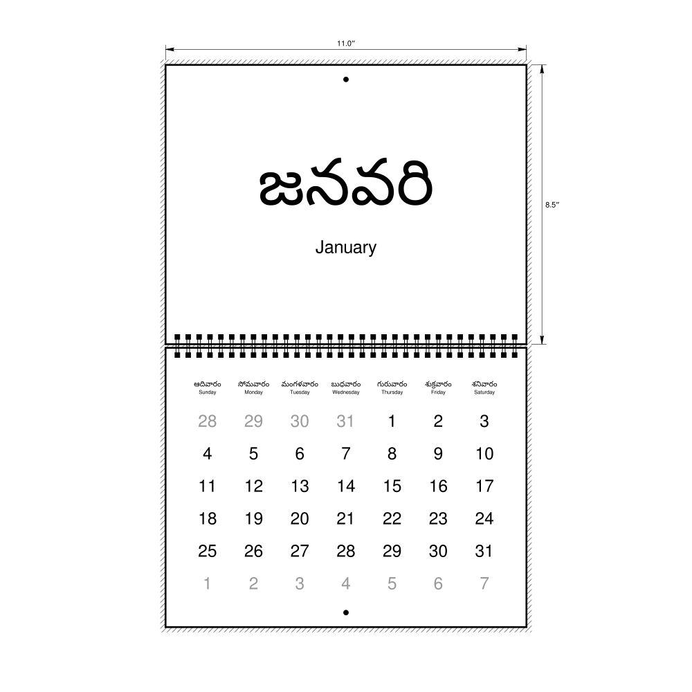 2026 Wall Calendar, Telugu-Labeled, Sunday-Start Layout, Wire-Bound, 11 x 8.5 in (27.9 x 21.6 cm)