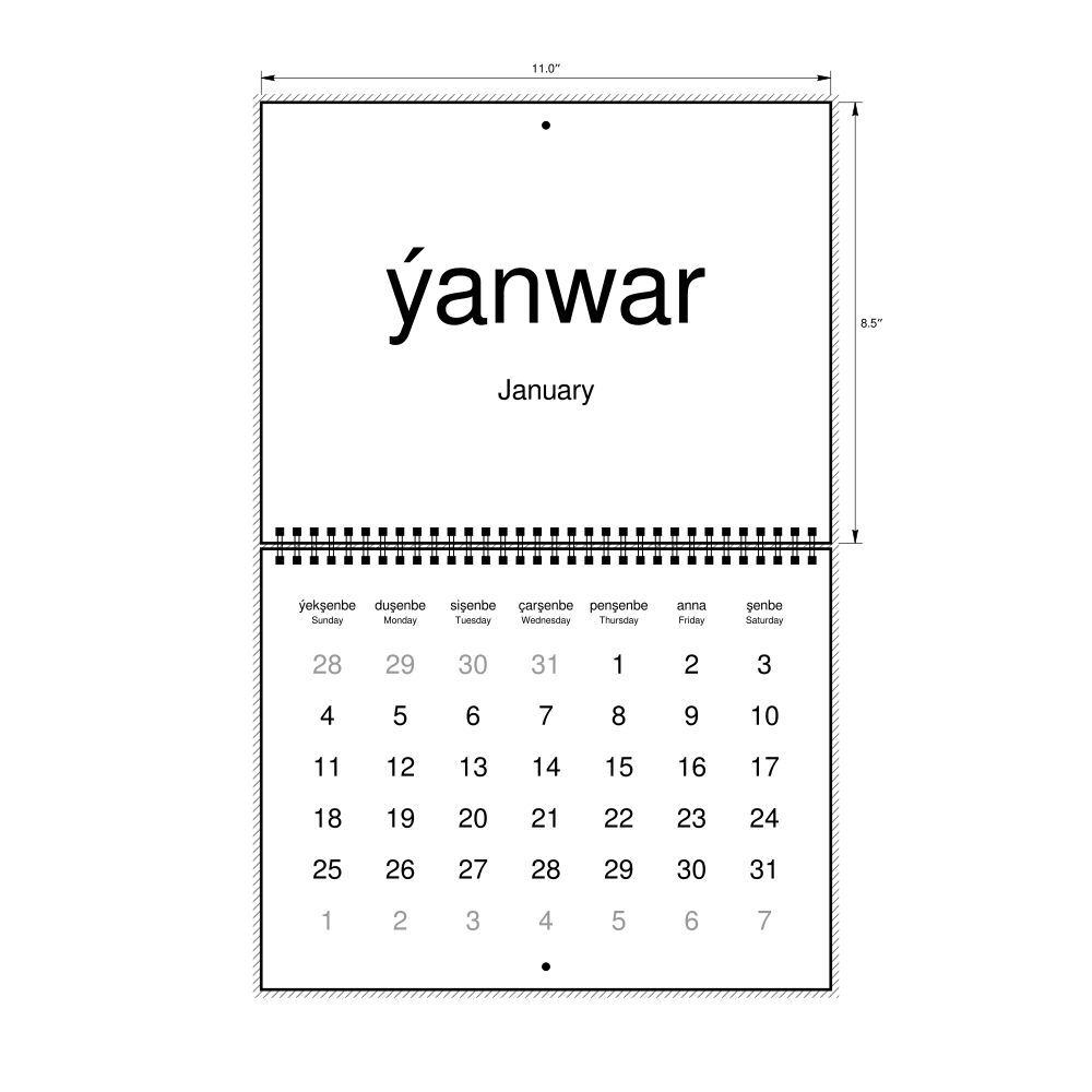 2026 Wall CalendarTurkmen/English-Labeled, Sunday-Start Layout, Wire-Bound, 11 x 8.5 in (27.9 x 21.6 cm)