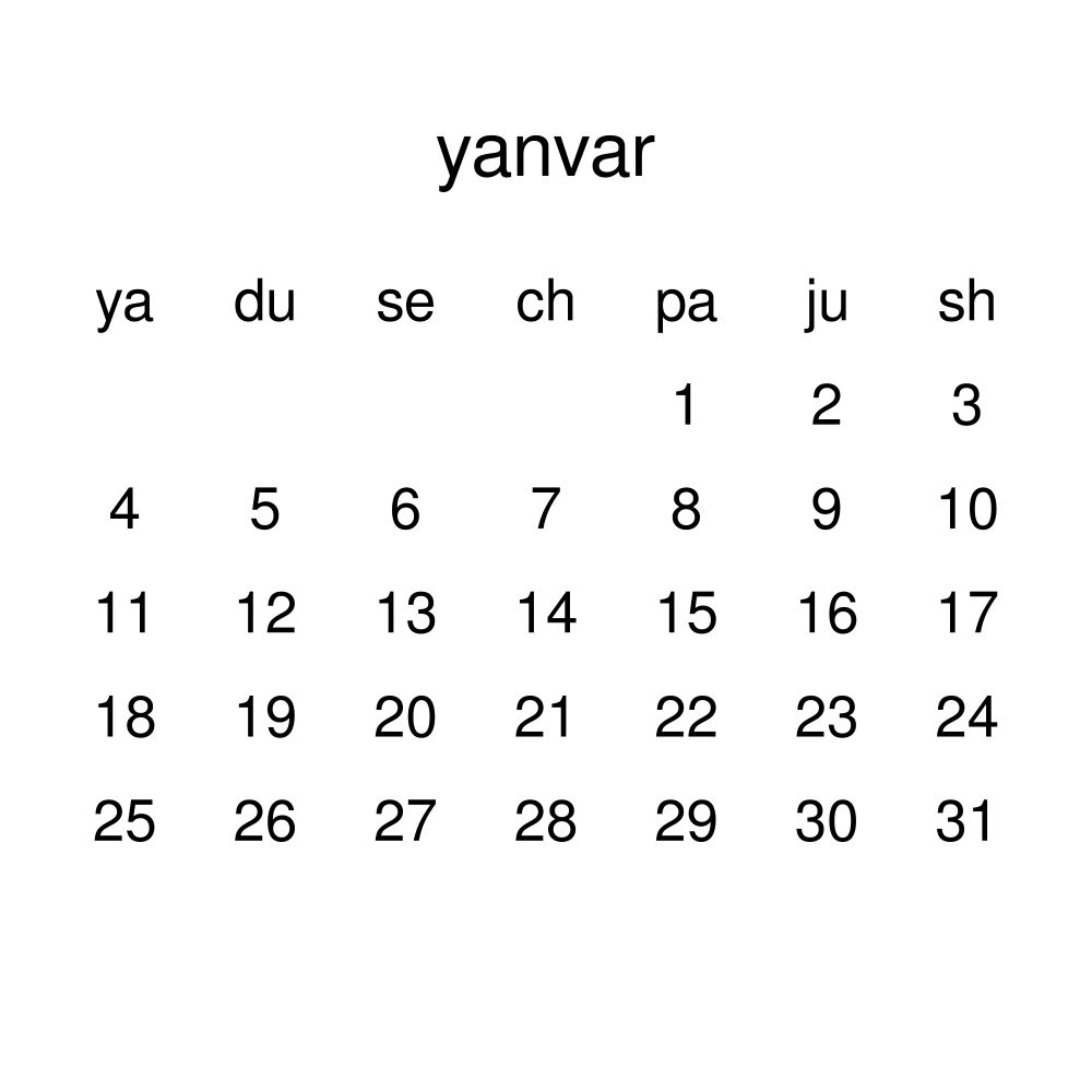 - Uzbek heritage speakers and cultural connectors - For individuals seeking to maintain a connection to their history, ancestral roots, or the culture associated with the Uzbek language, the calendar serves as a daily cultural marker. Use it in your home, office, library, or museum as a link to linguistic and cultural identity that integrates Uzbek into your everyday life. Familiar language script and naming conventions may also provide a sense of home in a foreign environment.